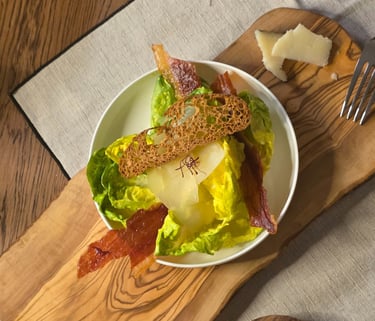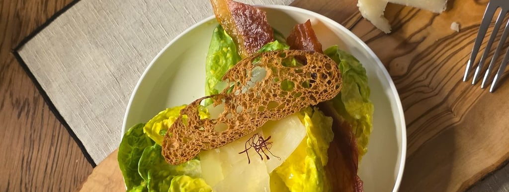 Knackiger Salat mit spanischen Käseraspeln, knusprigen Ibérico-Chips, Croutons aus Pan de Cristal und hausgemachtem Safran-César-Dressing.